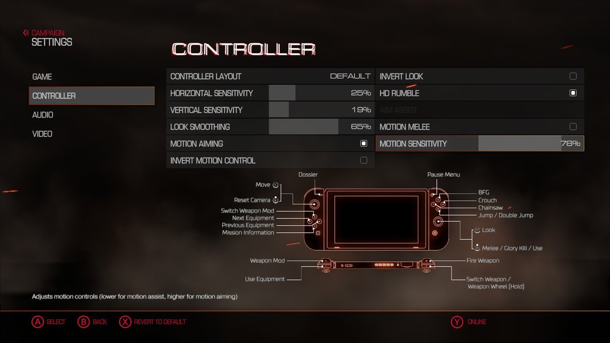 If you are coming over from Splatoon, you will notice a key difference between how the gyro controls work in that game as opposed to DOOM. In Splatoon, the analog stick handles your left-right camera motion while all of of your precision aiming is handled via gyro. In fact, your analog stick in Splatoon doesn’t allow you to look up or down at all. It is really well done in the context of the game and makes the motion controlled aiming work intuitively for anyone. In DOOM, the default controls have it so your analog stick will give you full-ranged camera motion, and this can sometimes feel like it is at odds with the new gyro aiming mechanic. It is fairly simple to get around though if you want to make the game control more like it does in Splatoon. All you have to do is go into your controller setting and turn the vertical aiming way down! Very simple!